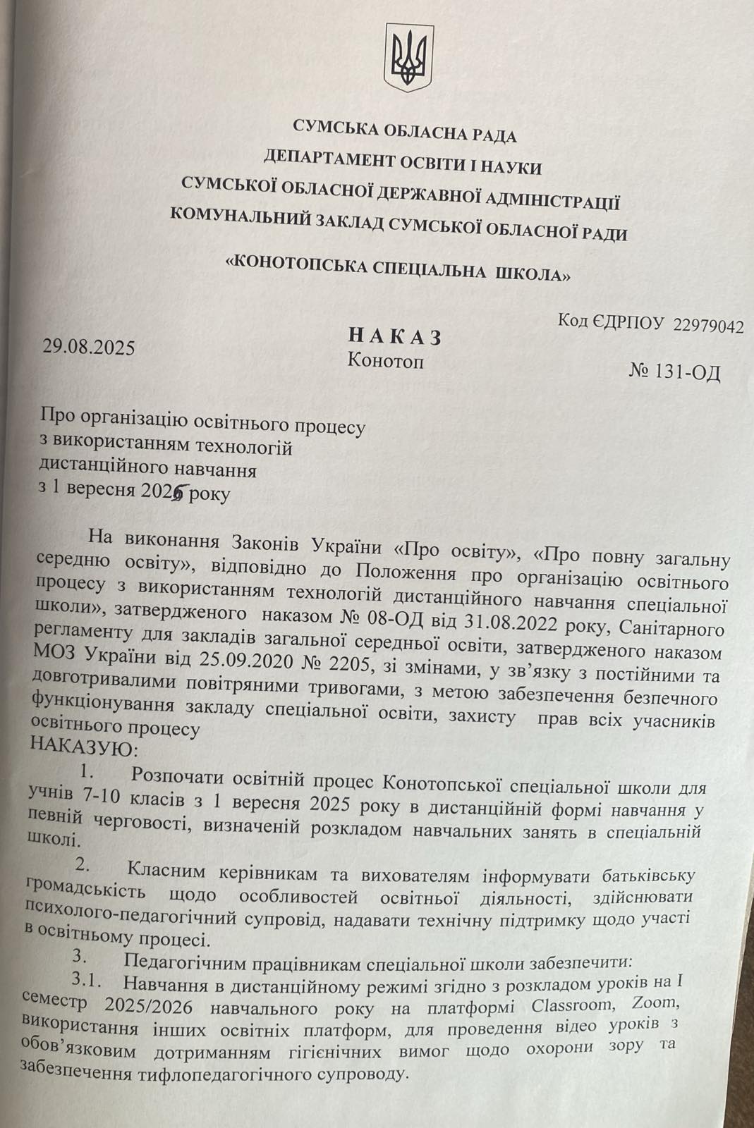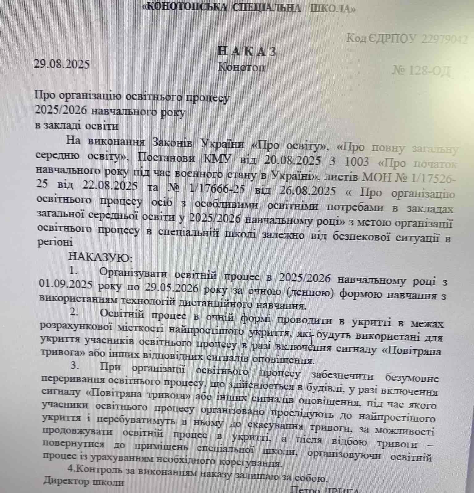 Наказ директора “Про організацію освітнього процесу 2025/2026 навчального року в закладі освіти”
